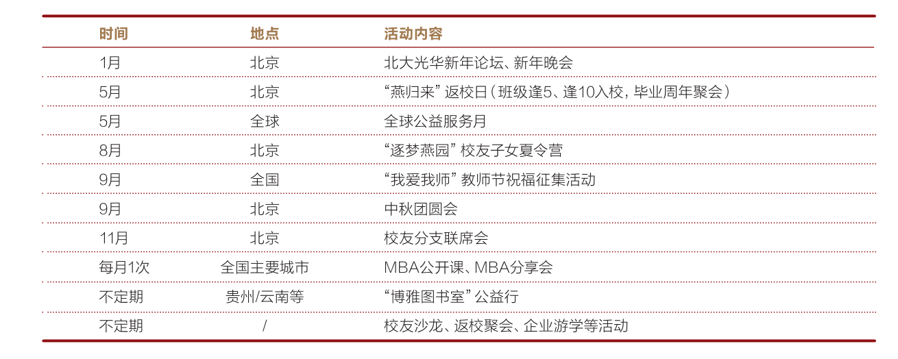 (3)推动光华校友之间、校友和北大其他院系校友的交流,促进合作互补和优势整合。