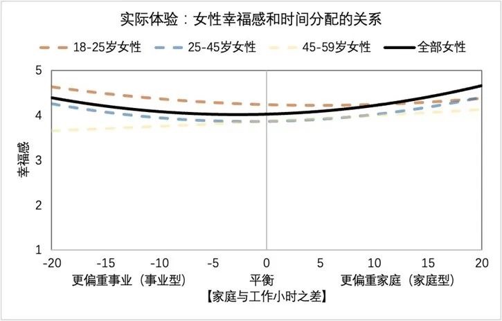 图注:横轴零点代表均等小时分配,即完全“平衡”;大于零代表家庭型,小于零代表事业型。平衡家庭-工作时间分配给女性带来最低幸福感(“双重负担”)。这一效应在青壮年女性群体(25-45岁)中尤为明显。此处以2010年中国家庭追踪调查”为例,图表为包括控制变量后的拟合结果。